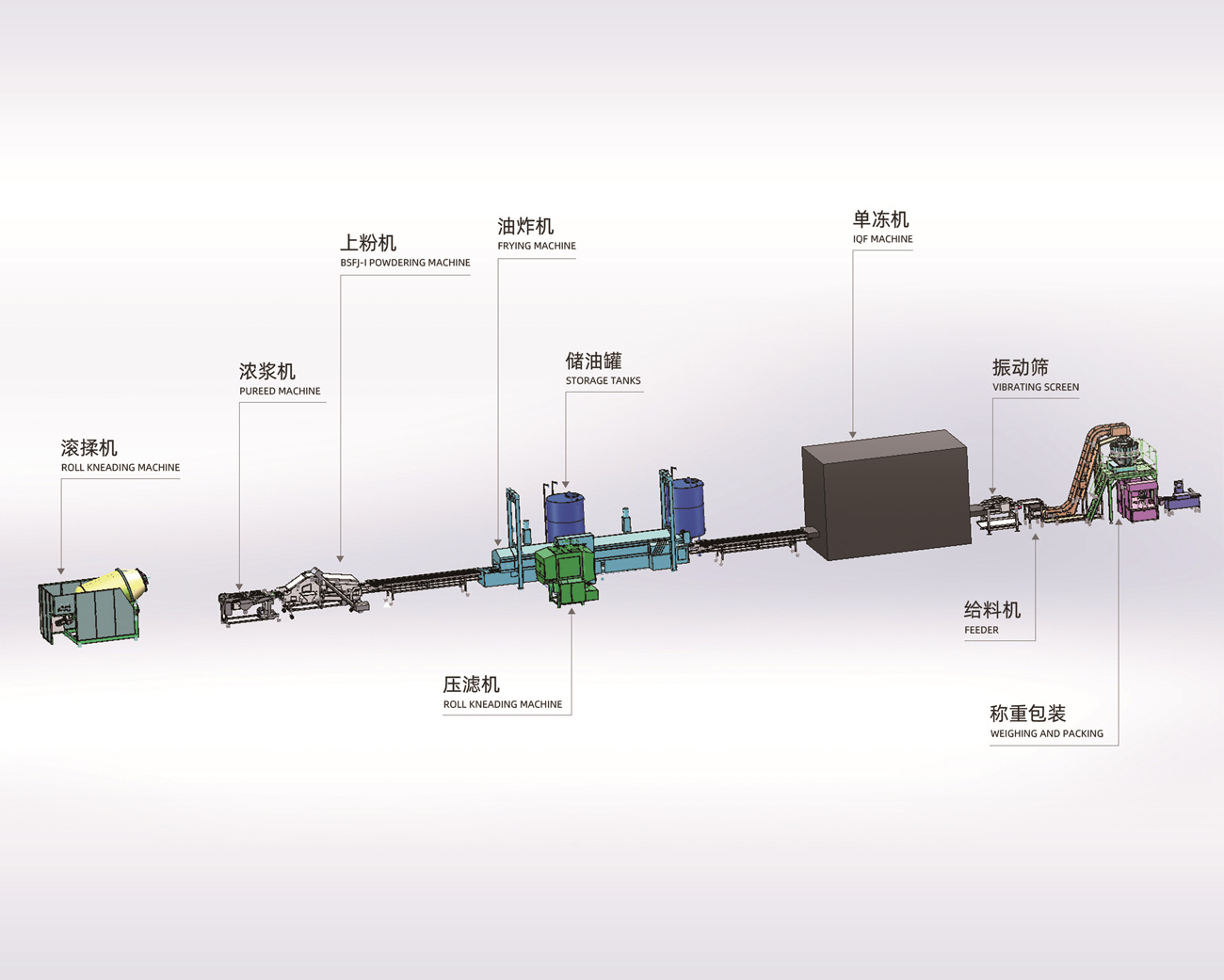 滾揉機(jī)、上漿機(jī)、上粉機(jī)、連續(xù)式油炸機(jī)、壓力式濾油機(jī)配稱(chēng)重、包裝、檢重設(shè)備,適用于各類(lèi)熟食、調(diào)理品企業(yè)。